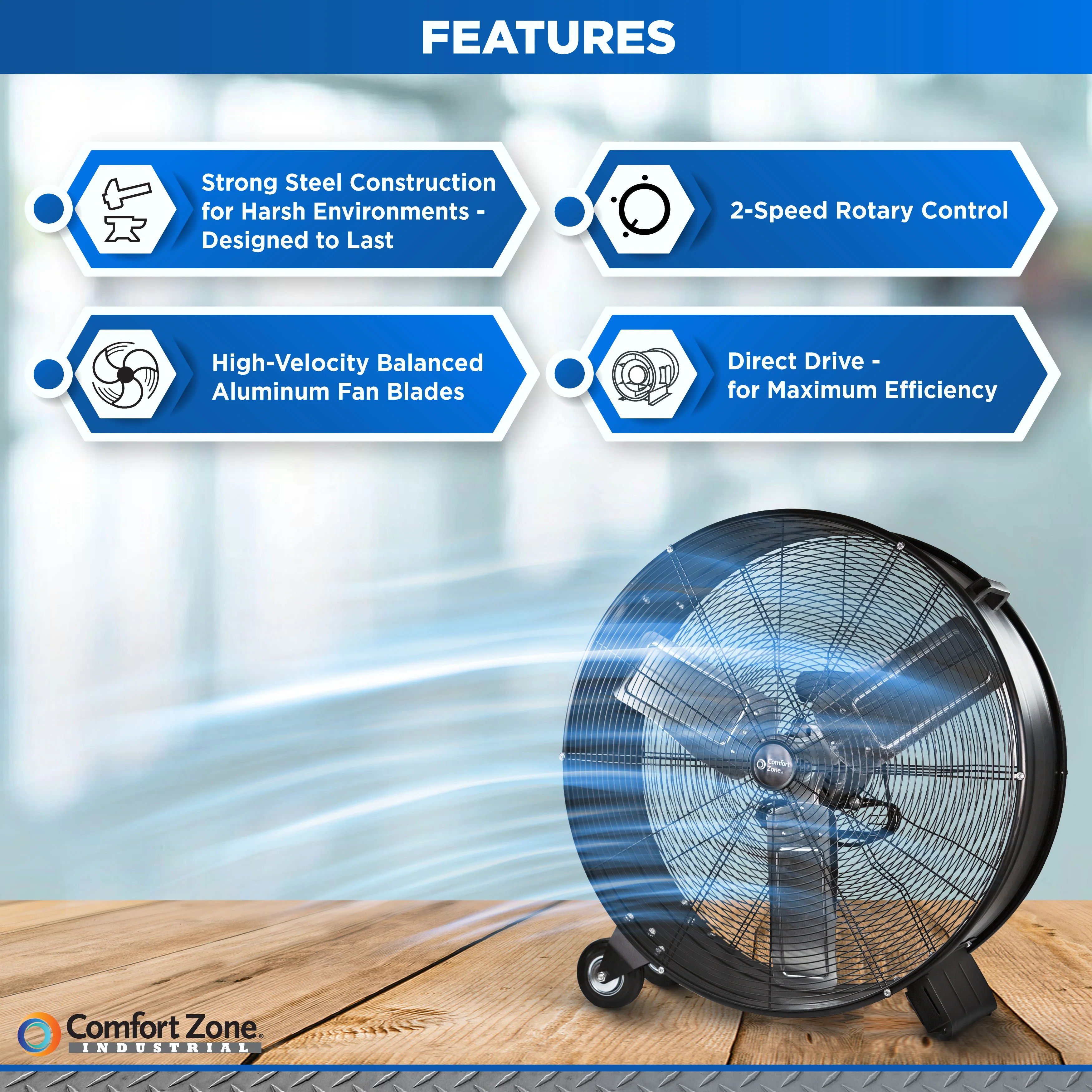- Features a direct drive design for durability and improved efficiency, with individually balanced aluminum blades that ensure smooth rotation.