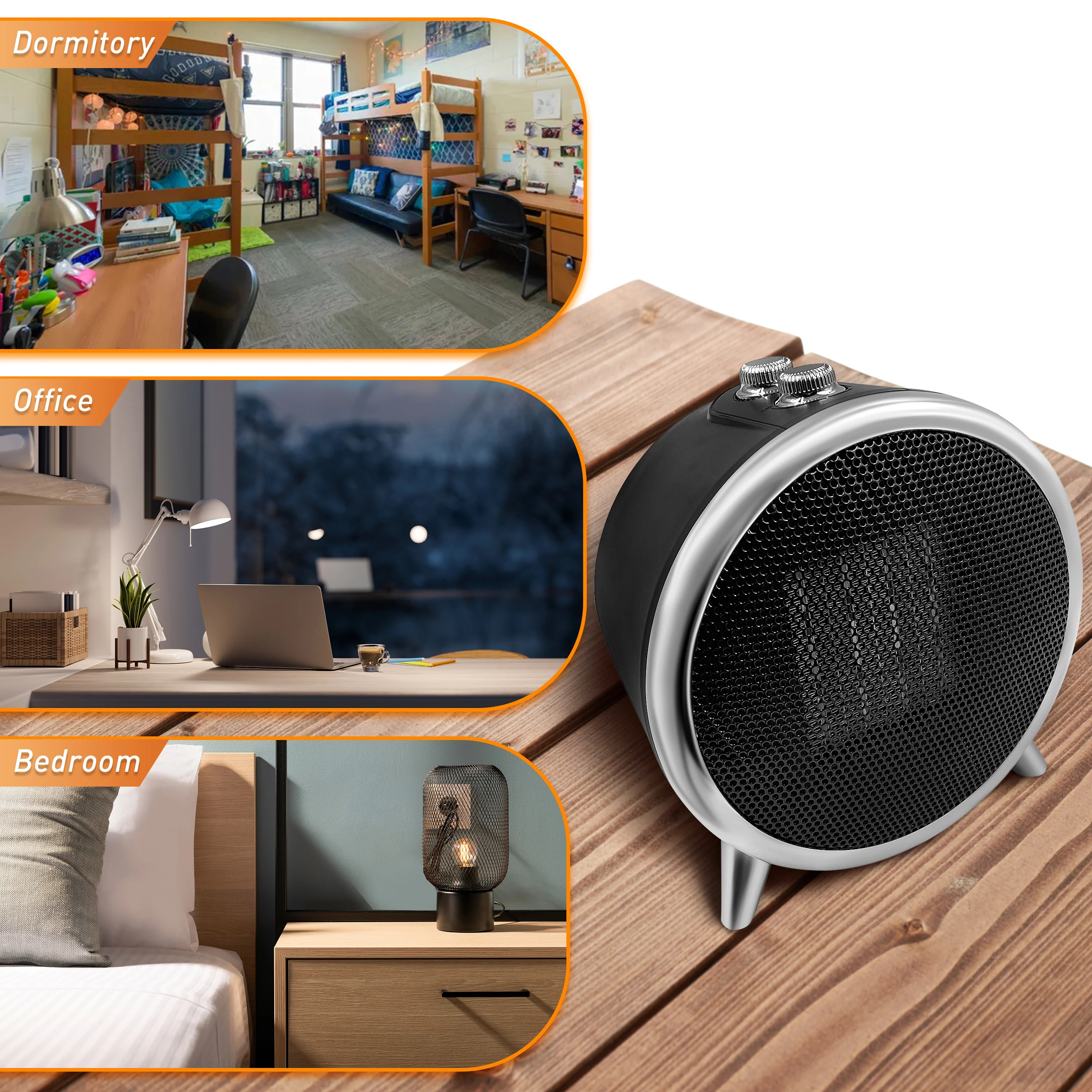 To customize the temperature, use the two heat settings and adjustable thermostat features. Thanks to its handy size, you can bring and use it anywhere you need it. The retro-modern style of this ceramic heater won’t ruin the aesthetic of your room. Use it on your work desk or in your living room without worrying about it clashing with your other items. Aside from function and style, we’ve made sure the heater has built-in safety features. The body of the heater remains cool during use and has a molded handle for safe handling. We've also included a tip-over switch that shuts the heater off when knocked over. Safe for homes with children and pets.
