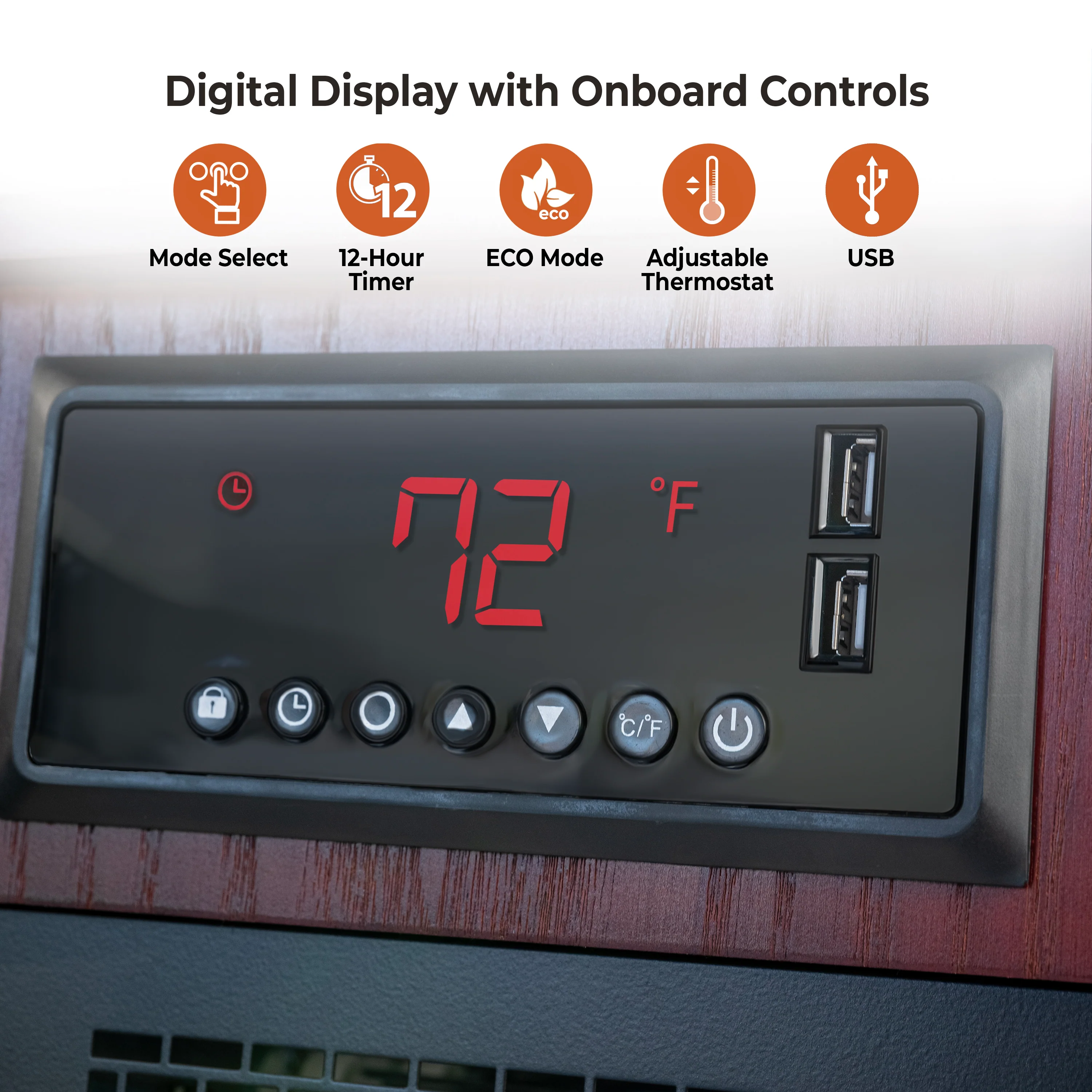 With six high-power quartz infrared heating elements, the Premium Wood Cabinet Infrared Heater by Comfort Zone provides even, room wide comfort. It has two heat settings and an energy saving ECO mode with a 12-hour on/off timer. The digital thermostat display makes room temperature easy to read and the full function remote allows electronic control from across the room. The built in USB charging ports are perfect for electronic devices such as iPhones and iPads. Safety features include swivel casters for easy movement, tip-over switch, and overheat protection system. Heater comes in walnut finish and adds a touch of sophistication and class to any large room.